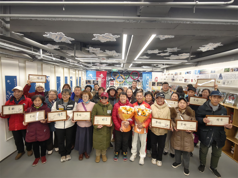 活动尾声,邓蓉蓉老师向社区赠送亲手制作的大型剪纸作品《十二生肖‘福’》,刘超英老师将“吉祥”字样墨宝赠予社区以及每一位来到现场的志愿者们。基地为两位嘉宾献上鲜花和马墩墩,表达诚挚的感谢与敬意。全体共同合影留念,定格下这场体育与艺术交织、邻里与温情相融的美好时刻。