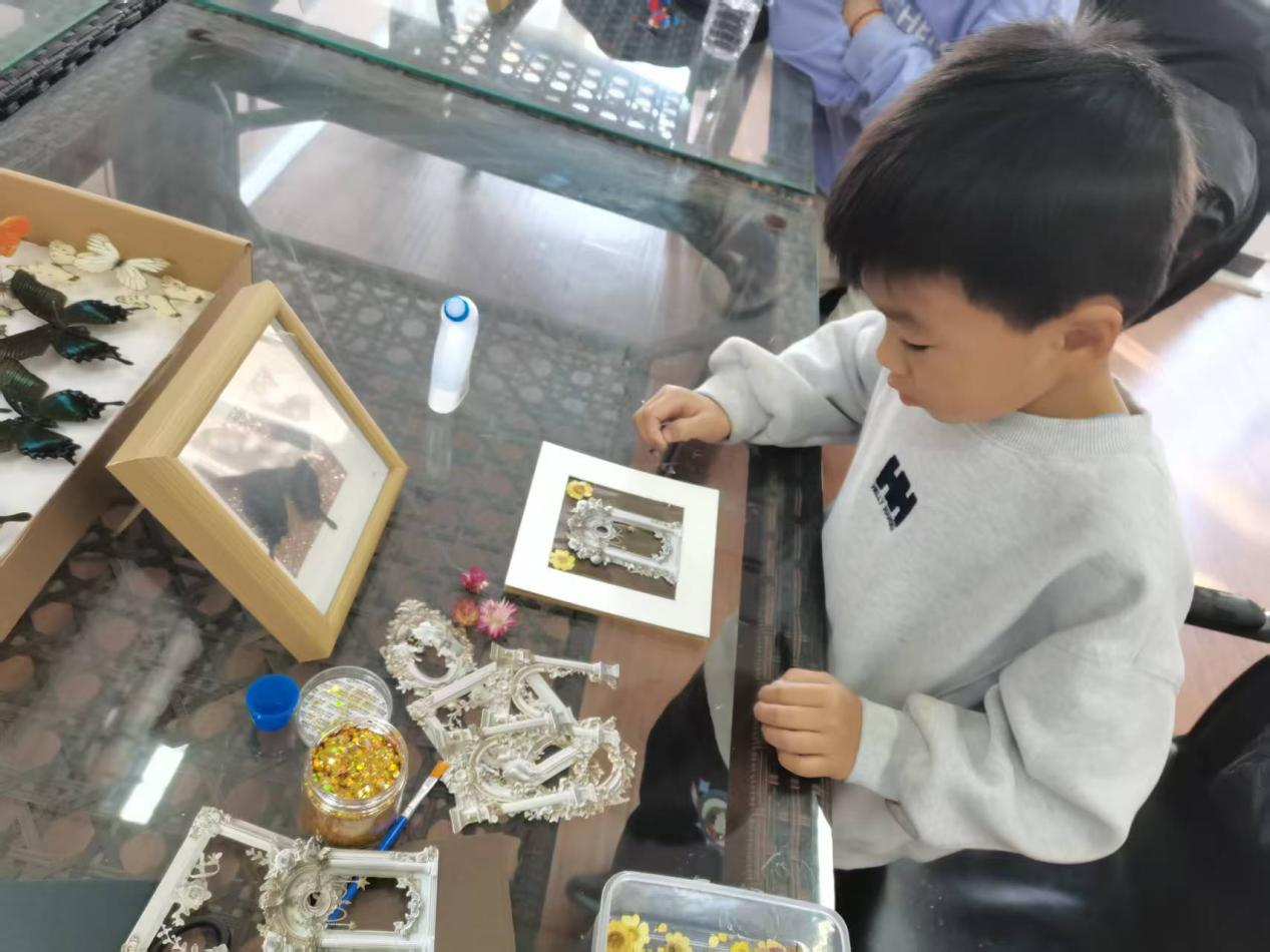 科普环节结束后,志愿者带大家一同制作蝶翅画,并示范讲解如何用色彩斑斓的蝶翅拼贴出形态各异的动物图案。随后,孩子们在家长的陪伴下,迫不及待地开始创作,将一片片蝶翅巧妙组合,制作出充满童趣的生态主题作品。创作过程中,孩子们专注投入,家长们也积极参与,亲子间的默契配合让现场充满温馨氛围。