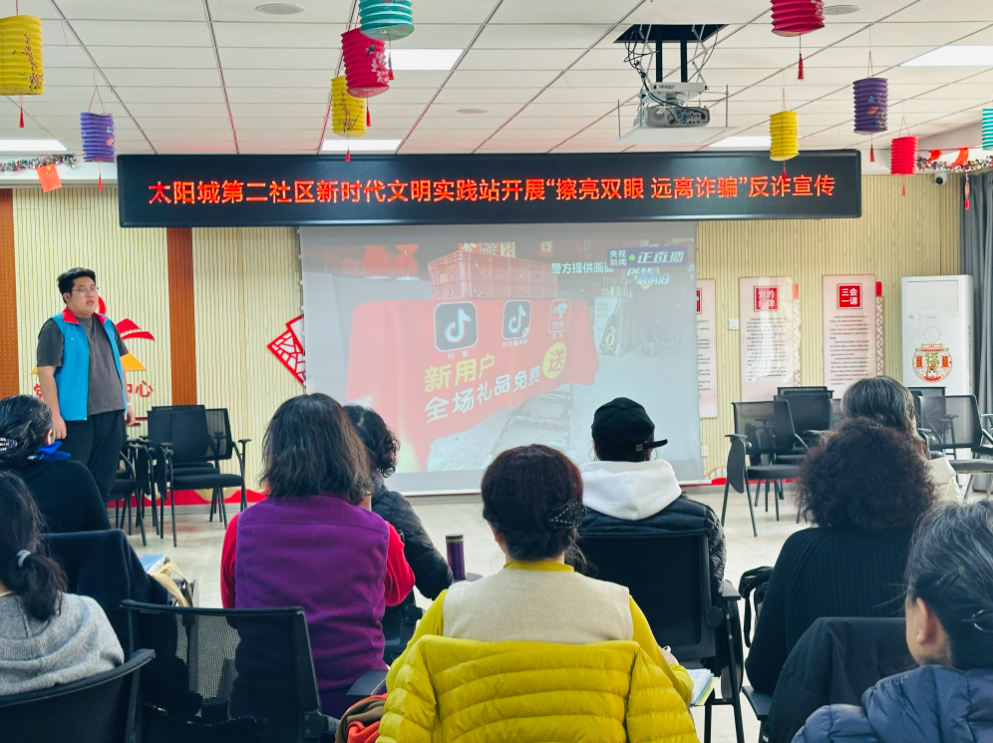 近日,太阳城第二社区新时代文明实践站开展了“擦亮双眼 远离诈骗”主题宣传活动,组织辖区居民集中观看央视新闻《反诈最前沿》节目,以真实案例敲响反诈警钟,推动反诈宣传入脑入心,营造“全民反诈、全社会防诈”的浓厚氛围。 [查看详情]