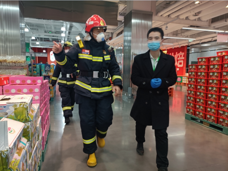 姚天龙(左)在商场开展灭火调研演练