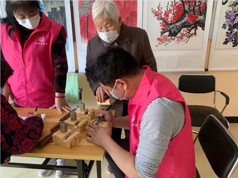老年国画班的影响力越来越大,就在下西市村幸福晚年驿站增加了为残疾人提供服务的项目时,刘军立刻提出要教授残疾人绘画,创新成立了“残疾人书画班”,吸引了镇域内热爱书画的残疾朋友们加入,报名现场就异常火爆。刘军发现不少残疾人拿东西有手抖的问题,想尝试通过艺术疗法,利用书法、绘画、篆刻等来锻炼他们手指、手掌、手腕、手臂的肌肉,以及训练手脑配合能力提升专注度,从而改善和预防手抖问题,将艺术和康复结合到一起,用“艺术疗法”多为更多的残疾人做出一点贡献。