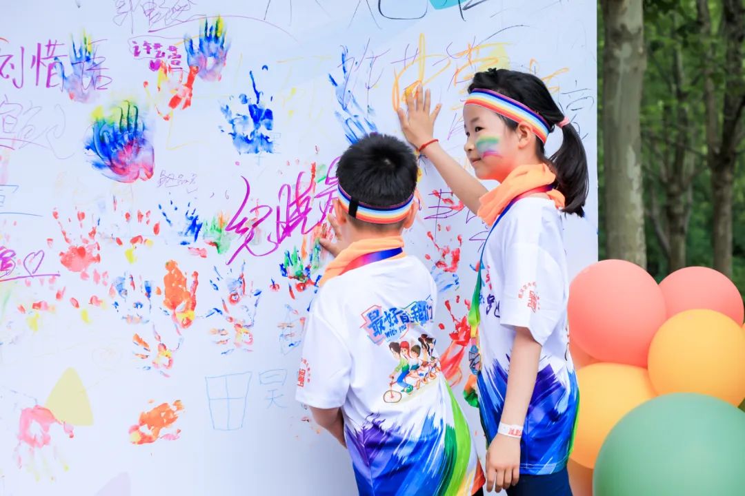 跑步结束时,每组家庭都体验了一次冲线的成就感和颁获奖牌的仪式感。最后,孩子们将一个个色彩缤纷的手印印在展板上,宣示了彩虹跑的胜利与喜悦。