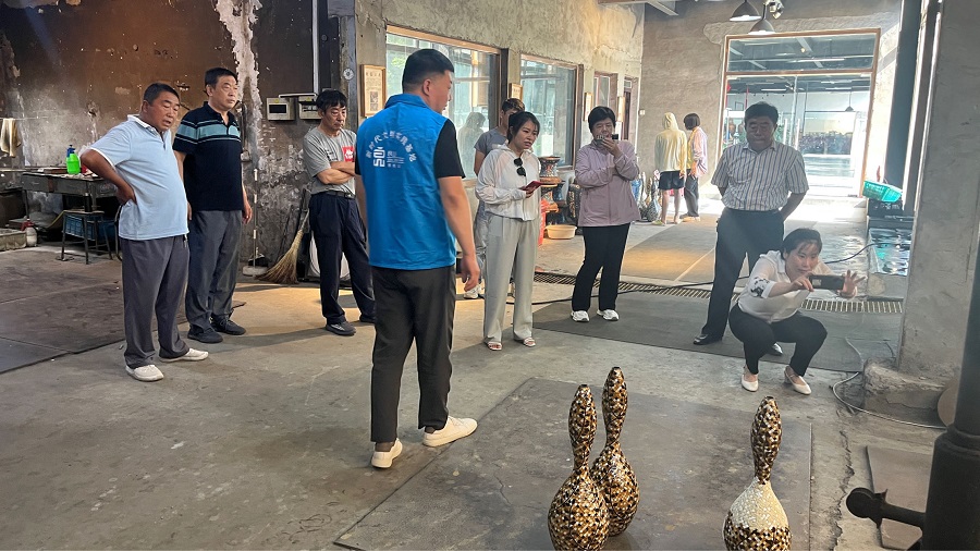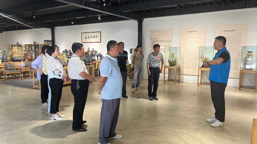 村民们在基地工作人员的带领和讲解下,开启了参观之旅,了解了基地的基本情况及景泰蓝的发展变迁、历史沿革。随后,讲解员耐心地给大家介绍了景泰蓝制作的七道大工序,设计、制胎、掐丝、点蓝、烧蓝、磨光及鎏金等制作工艺。
