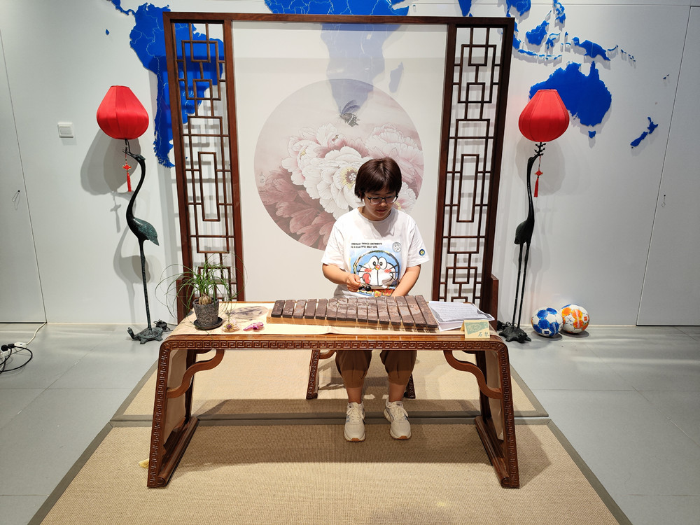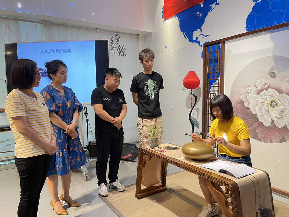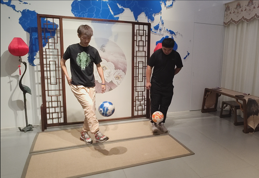 静中取动,动中求静。随后,大家体验了非遗工艺品鉴赏、石琴演奏、色空鼓敲击、电吉他弹唱等环节,其中单脚秀足球致敬了永不褪色的足球精神。