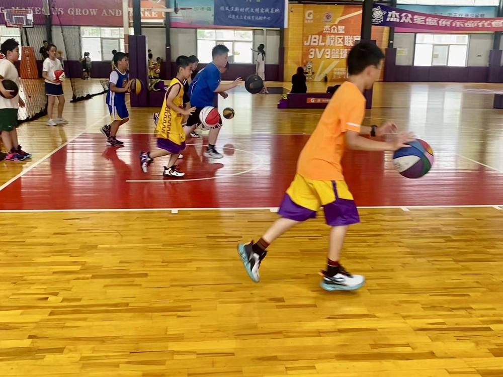 活动中,教练员对低运球、高运球、v字运球、胯下运球等基本功进行了动作示范和拆分讲解。随后,青少年们在教练员的指导下,有秩序且充满激情地练习各项动作,配合默契、动作十分协调。