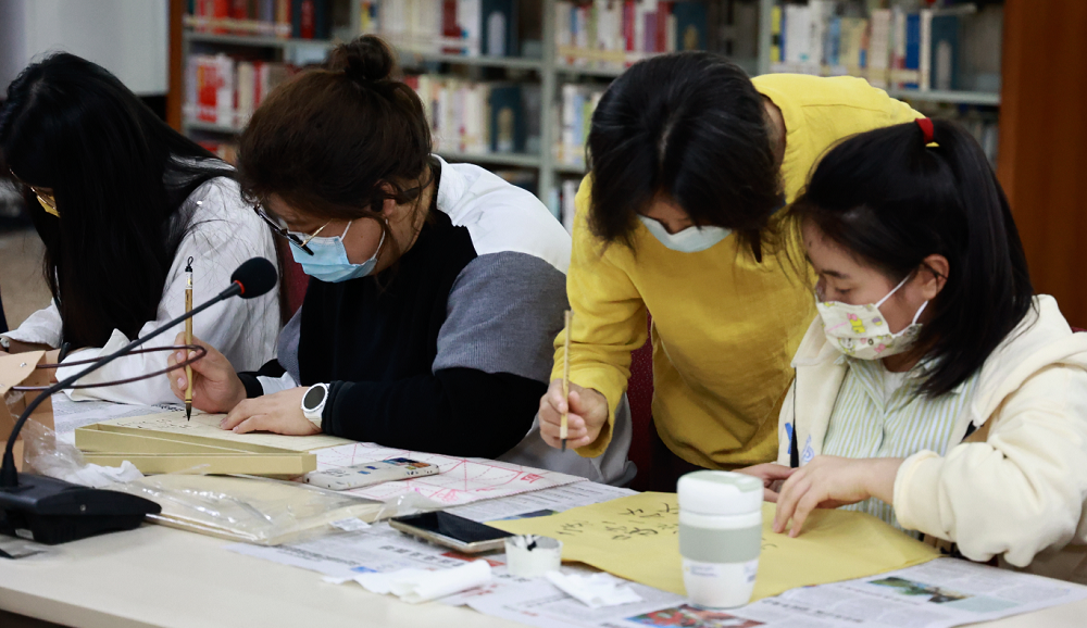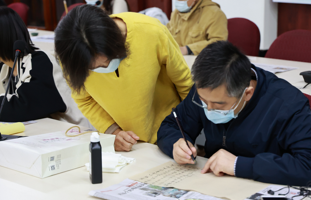 活动特邀书法爱好者秦学玲老师现场为大家讲授软笔书法笔、墨、纸、砚的选择,软笔的保养,镇纸、笔架、毛毡垫等书法工具使用,以及软笔书法书写方式、执笔方法等内容。秦老师以楷书为例,现场演示了五指双勾执笔法和悬腕、枕腕等书写方式,中锋落墨、自然成书。活动过程中,大家纷纷尝试用各种方式书写毛笔字,交流书写心得,体会书法带来的美好时光。