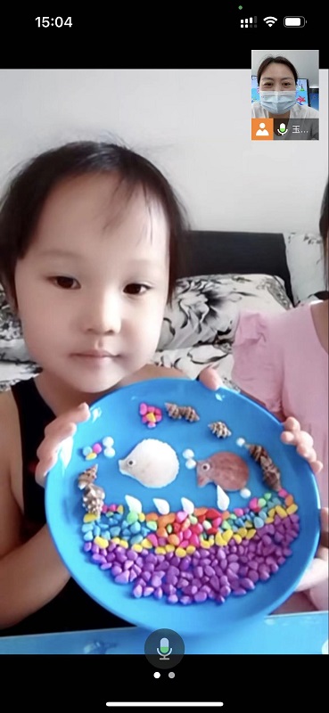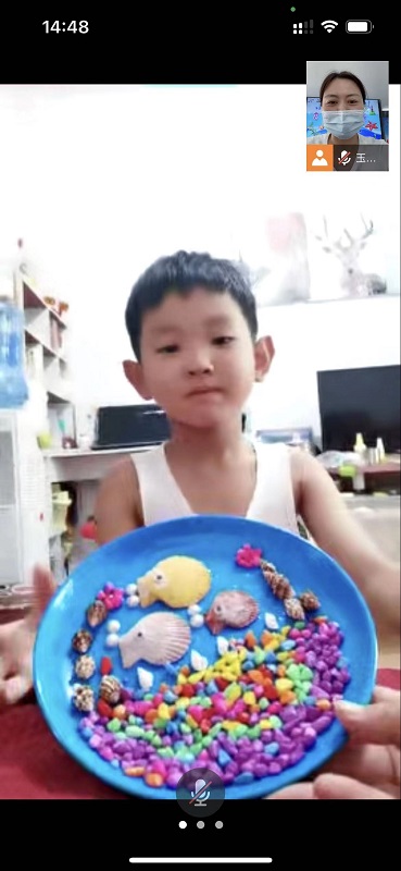 老师讲解了构图、选材、原材料形状、色彩搭配和粘贴方法。五彩斑斓的小贝壳,像一颗颗耀眼的星星点缀着蓝色的大海。一片贝壳里面有一个世界,很多贝壳黏贴到一起组成的就是一副美丽的海洋画卷……小朋友们在老师的指导和带领下,很快动起手来,漂亮的贝壳在指尖绽放出一幅幅奇妙的图案。