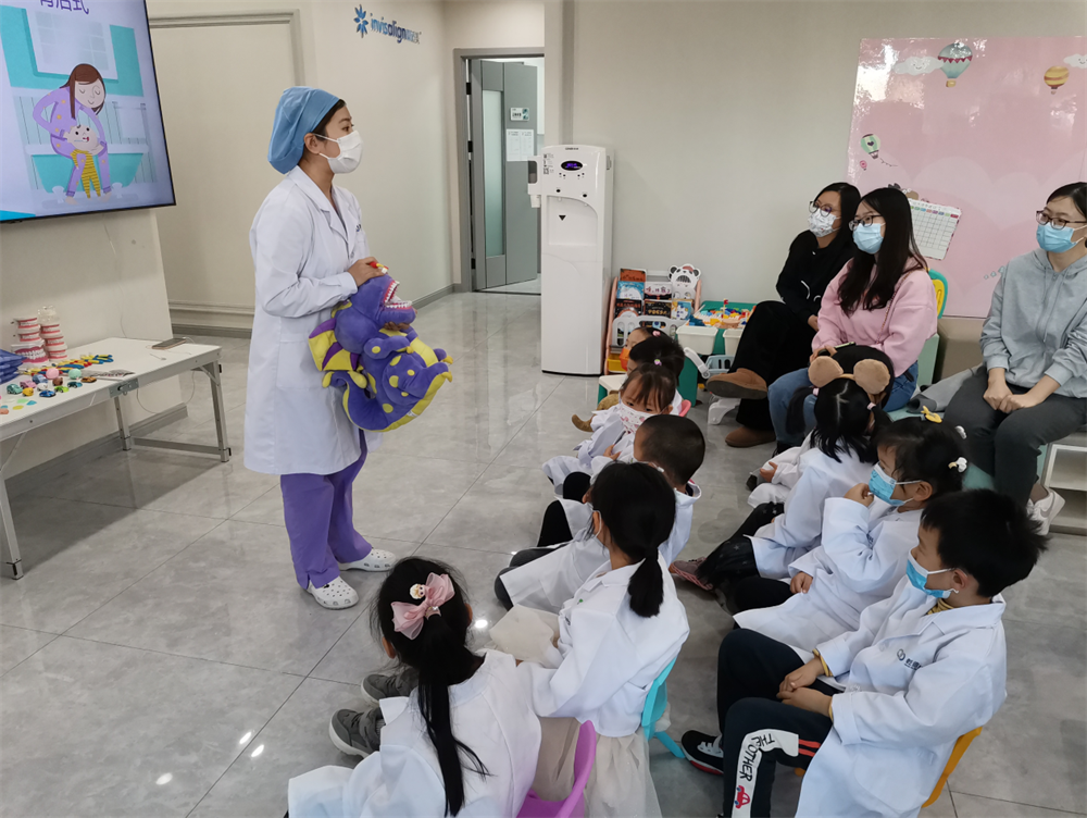 牙科医生讲解了牙齿结构,龋齿形成、预防及常见刷牙误区,并利用牙齿模型现场演示科学刷牙方法。通过生动有趣的互动,进一步提高了小朋友们的口腔健康意识。
