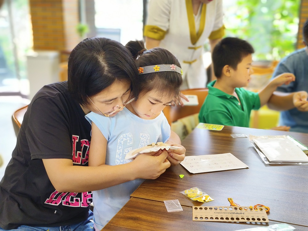 随后,老师为孩子们准备了刺绣的手工制作材料包,在老师和家长的帮助下,孩子们绣针舞动、丝线配色,在一针一线之间,独特又奇妙的刺绣作品就诞生了。