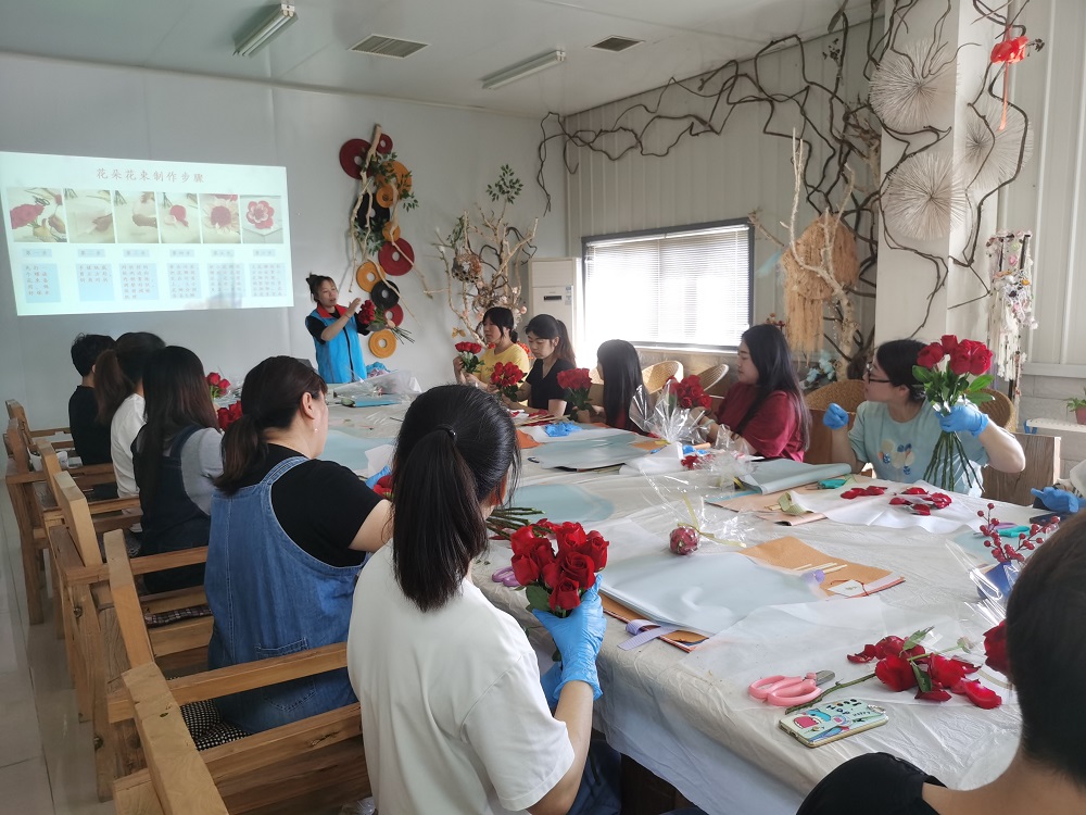 活动现场弥漫着鲜花的芬芳,洋溢着幸福的味道,传递着浪漫的气息。插花老师一边为大家介绍花卉的名称、花语、搭配知识、插花要诀等,一边进行插花示范。在插花老师的指导下,群众发挥自己的想象力和创造力,把各色鲜花自由组合在一起,场面温馨融洽、笑语不断。在这个特别的节日,她们为自己最爱的人创造出承载着满满爱意的花篮,送出最美的祝福。