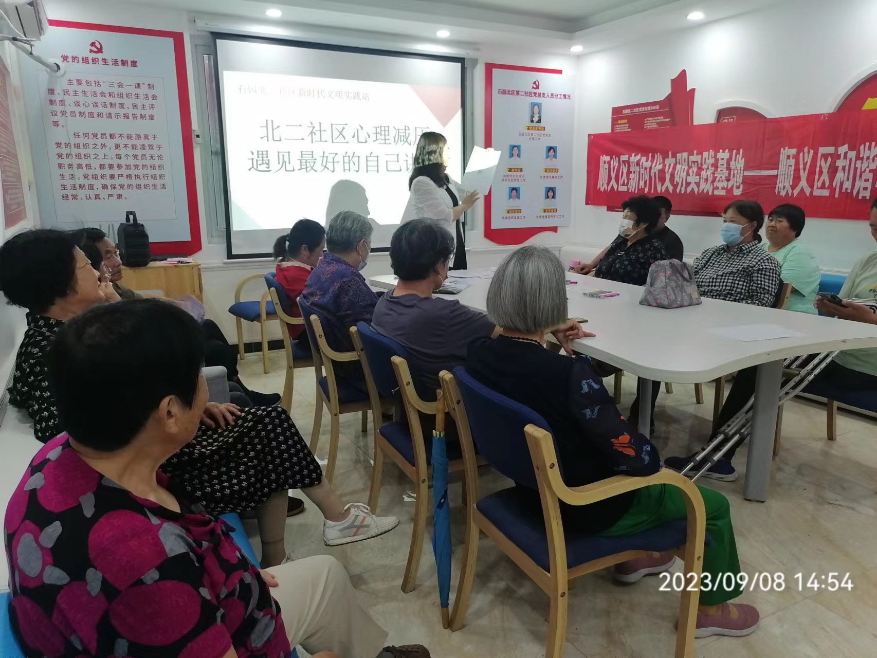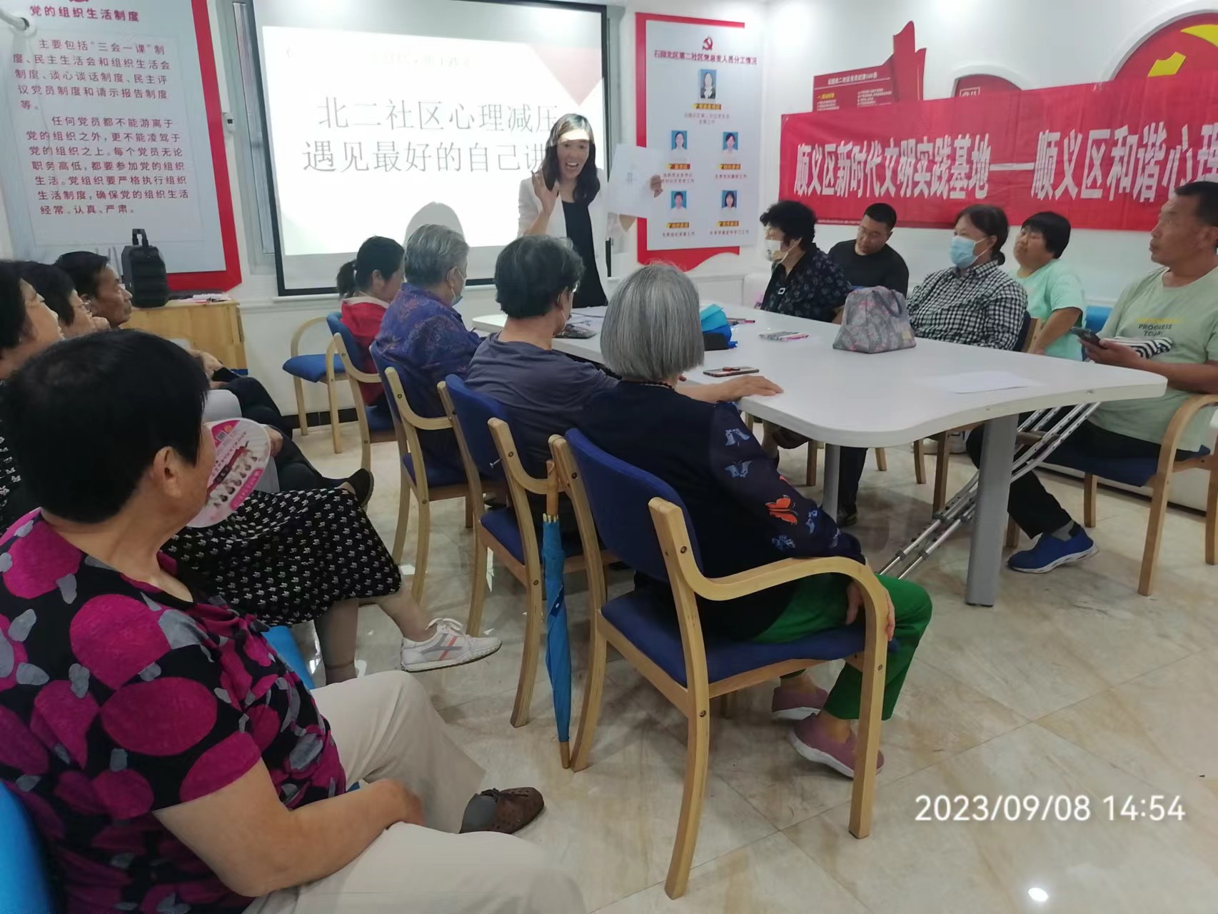 9月8日,顺义区和谐心理咨询中心新时代文明实践基地心理专家王凤英老师受邀为石园街道北二社区社区工作者及志愿者开展了主题为《心理减压,遇见最好的自己》的心理健康讲座。