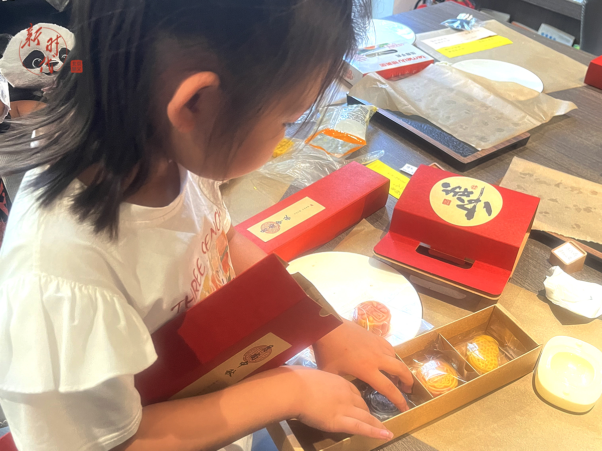 随后是包月饼环节。月饼是中秋佳节的传统美食,自然必不可少。孩子们早就满心雀跃、跃跃欲试,在工作人员简单介绍了食材、制作工具和方法后,大家就纷纷开始亲自动手制做起月饼。月饼寓意着团圆,自己做的月饼拿来送父母,寓意更加珍贵。