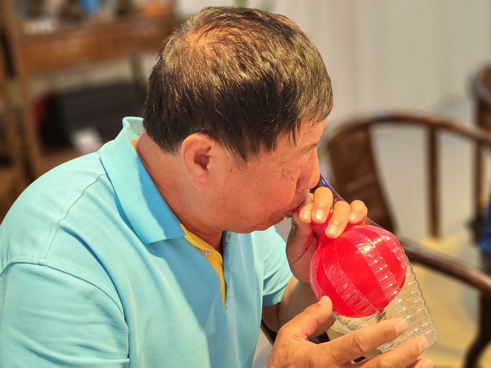 随后,基地工作人员现场指导大家用喝完的的矿泉水瓶和气球制作红灯笼,先把矿泉水瓶底部剪成条状,然后制作出灯笼穗儿,最后吹气球制成灯笼。制作过程虽然简单,但制作完成的灯笼丝毫不逊色,非常喜庆美观。最后,大家一边品月饼,一边赏灯笼,感受着浓浓的节日气氛。