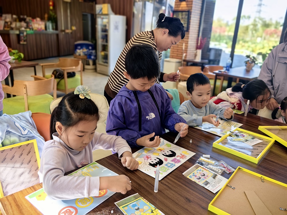 随后,小郁老师为孩子们发放了纽扣工艺粘贴画用的材料,孩子们认真地将一粒粒五颜六色的纽扣粘贴在图画上,制作出一张张“节约粮食,光盘行动”为主题的纽扣画。