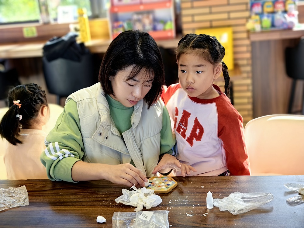 随后,小郁老师给孩子们讲解了马赛克多彩杯垫的制作流程,并给大家分发了制作材料。孩子们拿到材料包后,便迫不及待地开始了自己的小创作。将酒精胶均匀的涂到杯垫底胚上后,孩子们按自己的喜好开始将马赛克方块粘贴在酒精胶上,拼凑出五彩缤纷的图案,最后用海绵蘸取海盐胶进行填充,晾干后,一个个创意十足的马赛克杯垫就制作出来啦!