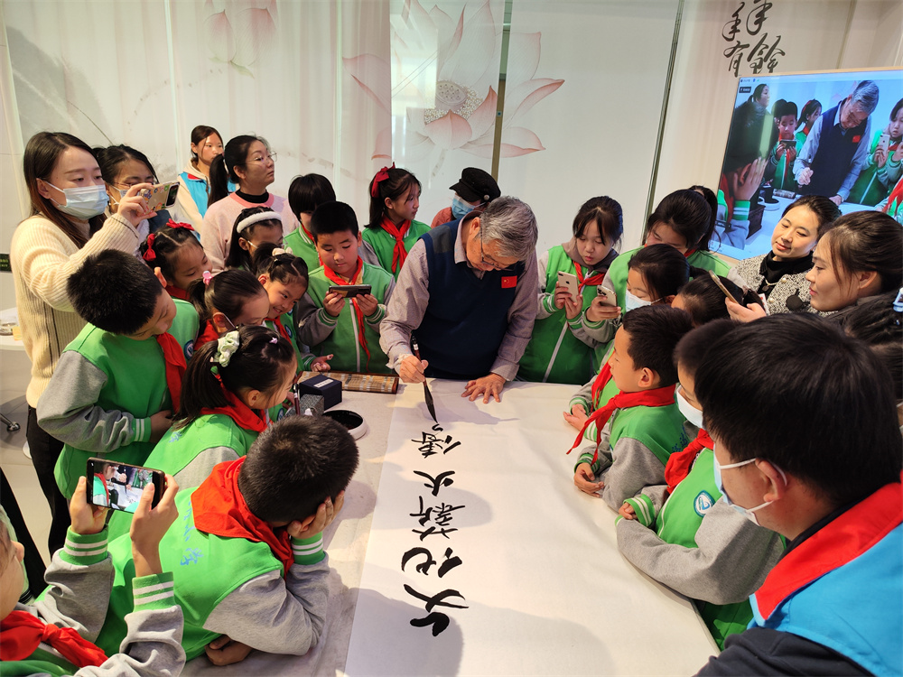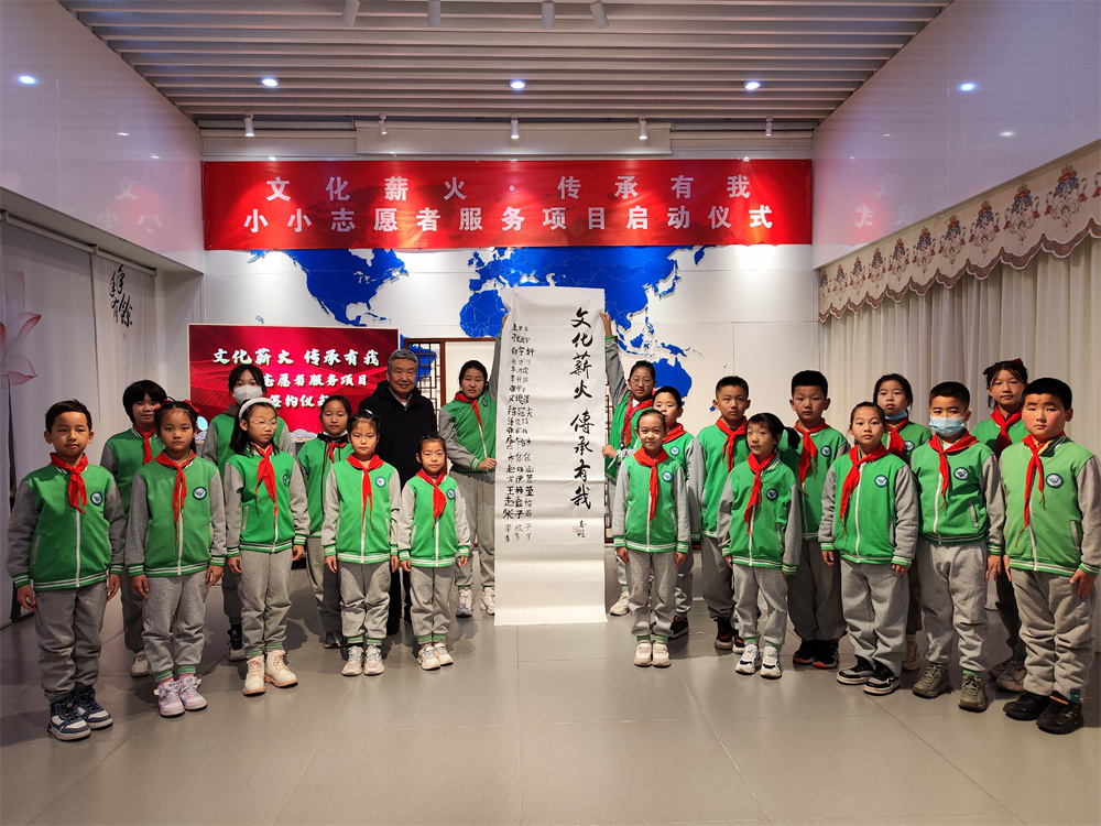 题词环节,杨志恒教授身躯挺直、目光坚定,苍劲有力的毛笔在宣纸上游动,“文化薪火·传承有我”八个大字呈现在大家眼前。孩子们围在杨教授身边,目不转睛地看着他挥毫泼墨,随后排起整齐的队伍,在纸上签下自己的名字,表达对成为优秀小小志愿者的承诺和信心。