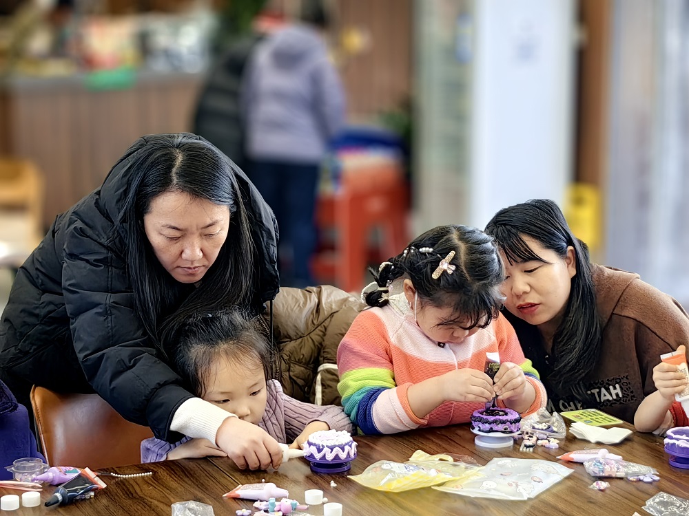 随后,小郁老师为大家发放了奶油胶音乐盒材料包,在小郁老师和家长的耐心帮助下,孩子们开始了奶油胶音乐盒的自由创作。大家用奶油胶挤出软软的色彩,形成波浪一般的线条,再粘上喜欢的小件玩偶,贴上可爱的蝴蝶结。整个制作过程中,小手主导、大手辅助,在装上音乐芯后,“天空之城”等优美的曲调缓缓响起,音乐盒瞬间有了灵魂,成为了独一无二的艺术品。