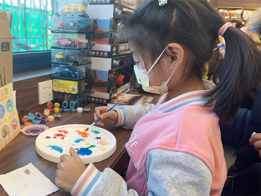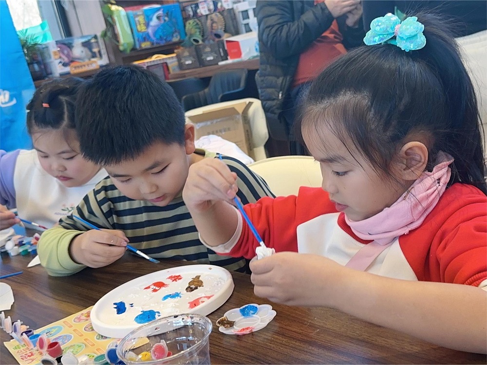 随后,小郁老师为孩子们发放了环保主题的立体浮雕石膏彩绘盘制作材料。在小郁老师和家长的带领下,孩子们拿到材料包后,便迫不及待地开始了自己的小创作。孩子们用画笔和斑斓的色彩,用各自独特的视角和独具匠心的构思与创意,创作出了一幅幅富有创意、清新、随性的立体浮雕画,大家都开心至极!
