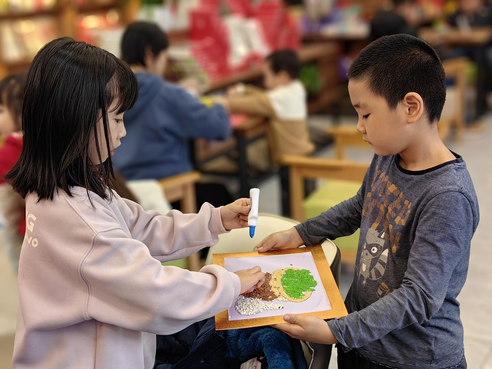 随后,小郁老师为大家讲解了豆粘画的制作方法,并给大家分发了制作材料。孩子们拿到材料包后,就迫不及待地开始了自己的小创作。在小郁老师的指导下,大家充分发挥想象力,通过构图、线条、明暗、色彩等造型手法,将各种豆子进行粘、贴、拼,最后就搭配出一幅幅生机盎然、栩栩如生的“腊八节”豆粘画,为节日增添了浓厚的喜庆氛围。