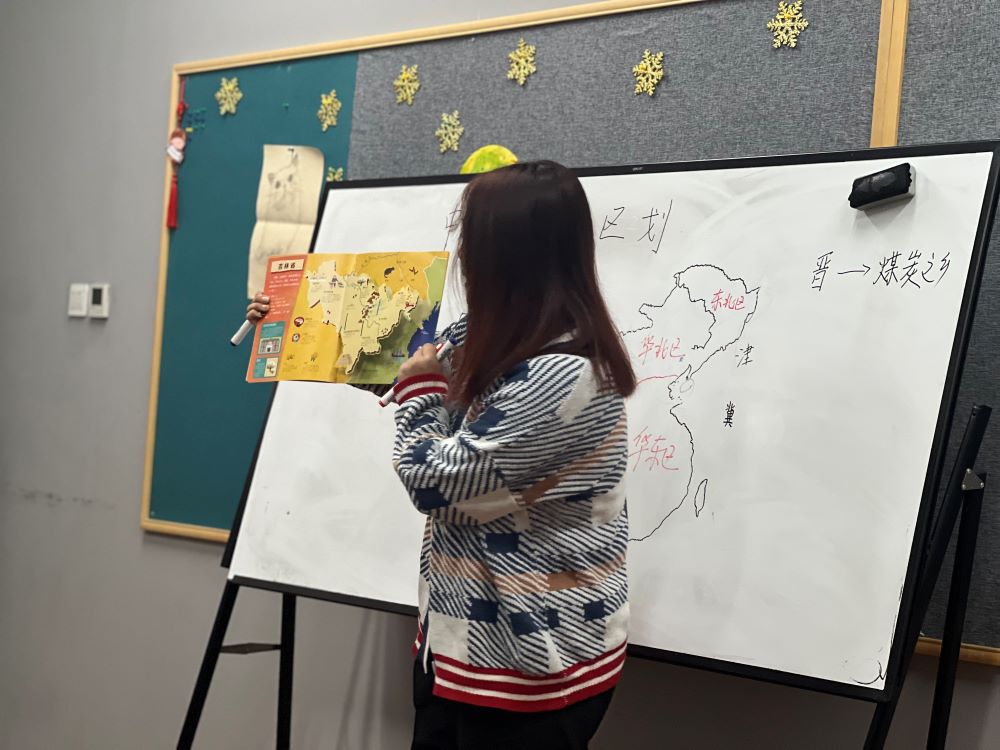 活动开始,老师先请一位小朋友参照绘本《你好呀!中国》画出了中国地图。随后,老师根据中国行政规划图为孩子们介绍了中国地理、历史文化相关知识。老师按照南北方省份逐一给大家介绍了各地的传统特色、方言文化,以及各地著名的山川、湖泊等知识,让孩子们领略了祖国的大好河山。最后,通过抢答游戏“省份简称”,老师带孩子们一起再次熟悉了中国的地理文化。