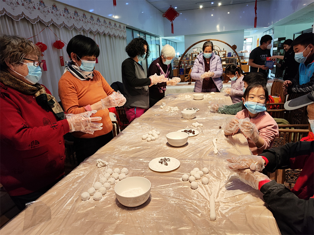 接着,大家围坐在一起,志愿者给大家分发好面团和馅料,居民们便开始“各司其职”,有的拿面团、有的搓圆、有的包陷。大家一边交流着包汤圆的技巧,一边闲聊着家常,在欢声笑语中,不一会儿,一个个圆润饱满的汤圆就包好了。