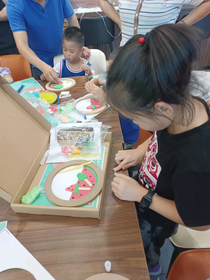随后,京京老师给大家分发了粘土相框的制作材料,孩子们兴致勃勃地和家长一起动手制作,在粘土相框上创作着自己心中的小暑节气,冰凉可口的草莓冰激凌、西瓜、还有盛开的花朵,孩子们尽情发挥想象力,最后制作出一个个靓丽缤纷的“小暑节气”粘土相框。