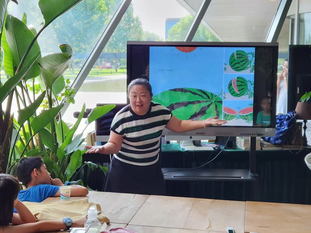 活动中,老师通过PPT为孩子们生动讲述绘本故事《西瓜游泳场》,让孩子们仿佛置身于五彩斑斓的西瓜游泳场,与故事中的角色一同嬉戏玩耍,现场欢声笑语不断。最后,老师带孩子们一起制作西瓜扇子,让孩子们在开心的创作中感受轻松、愉悦的夏日气息。