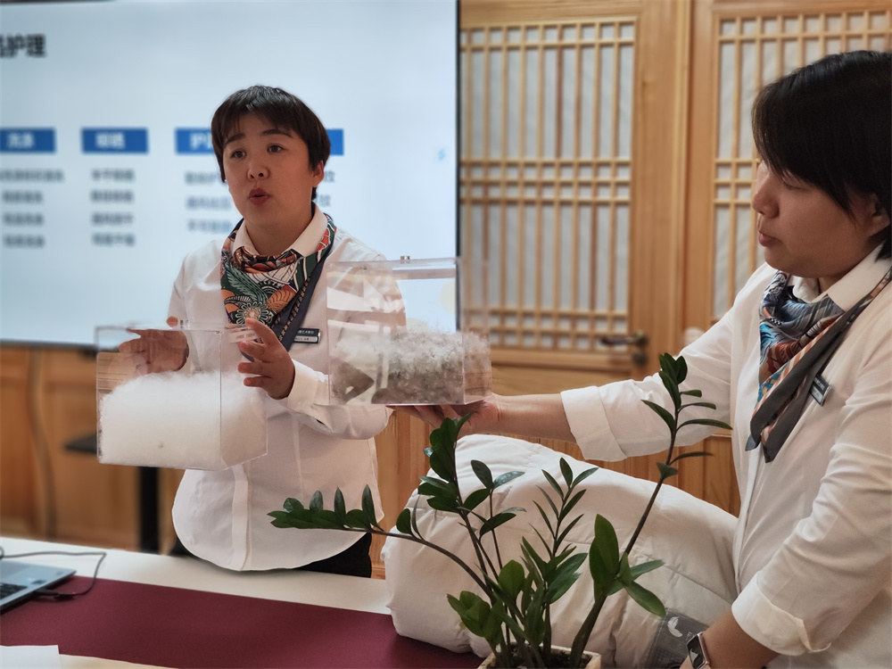 在家纺知识讲座环节,基地公益讲师为大家详细介绍盖鹅绒被的诸多好处。对于鹅绒被的采购要点和护理方法,讲师也给出了专业建议,为居民的舒适家居生活提供了实用指南。