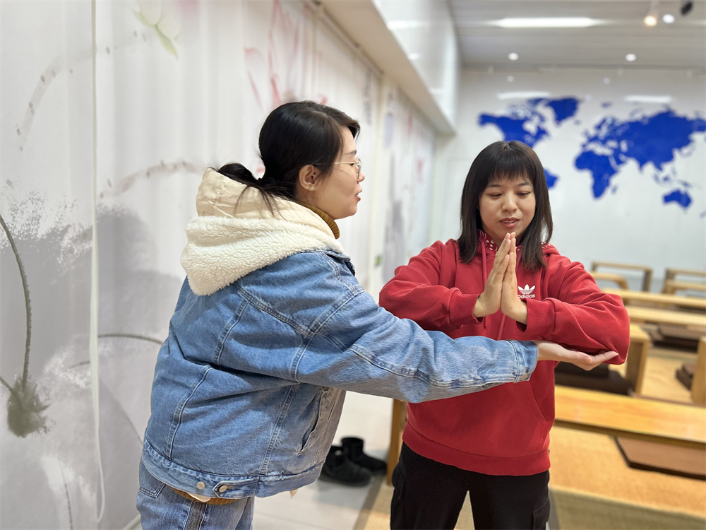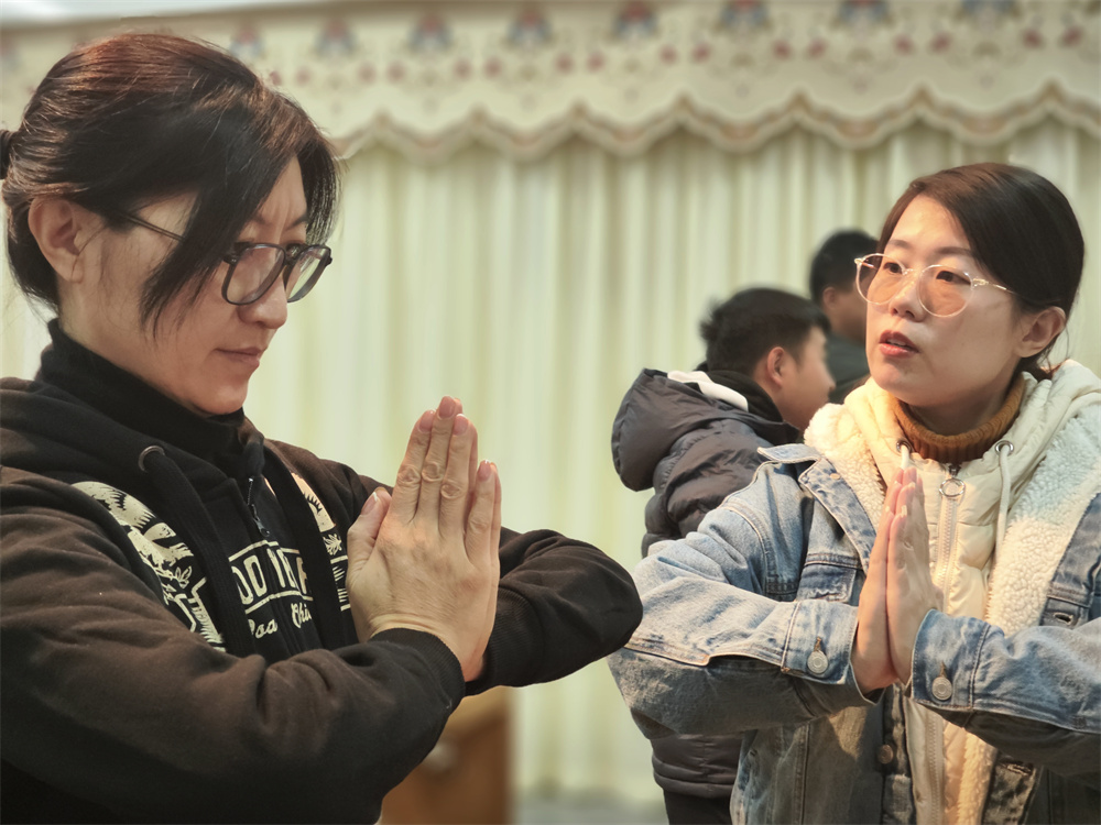 在八段锦之韦陀献杵的学习过程中,老师详细拆解动作。“双脚与肩同宽站立,膝盖微屈,这是根基,如同大树扎根,稳而有力。”老师边说边示范,同时观察大家的动作并及时纠正问题。