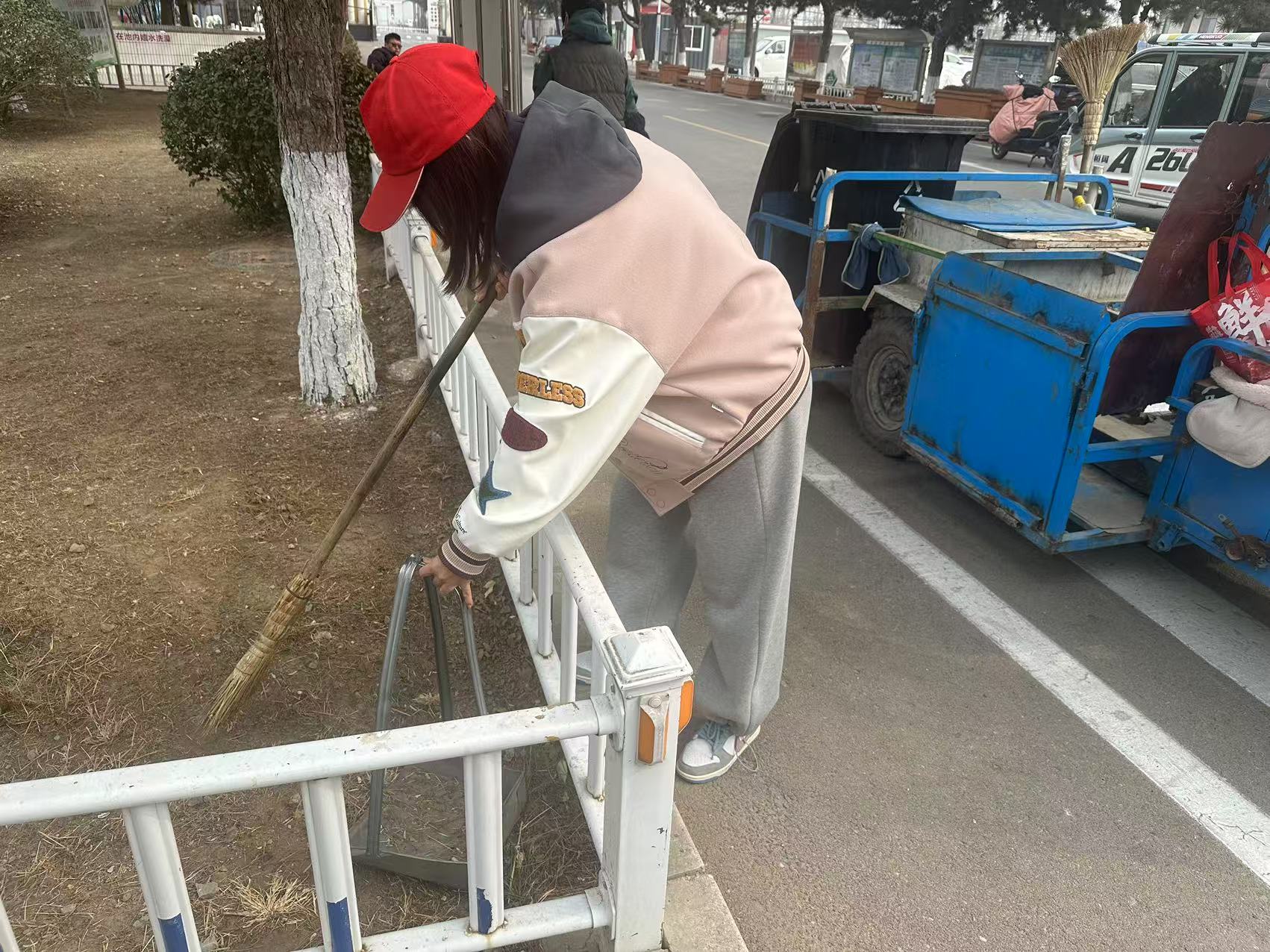 清早,身着红色马甲的团员教师胡雪晴来到社区。手持扫帚、垃圾夹、抹布等工具,分组对社区主干道、绿化带、健身广场进行"地毯式"清理。经过两小时劳动,社区环境焕然一新。