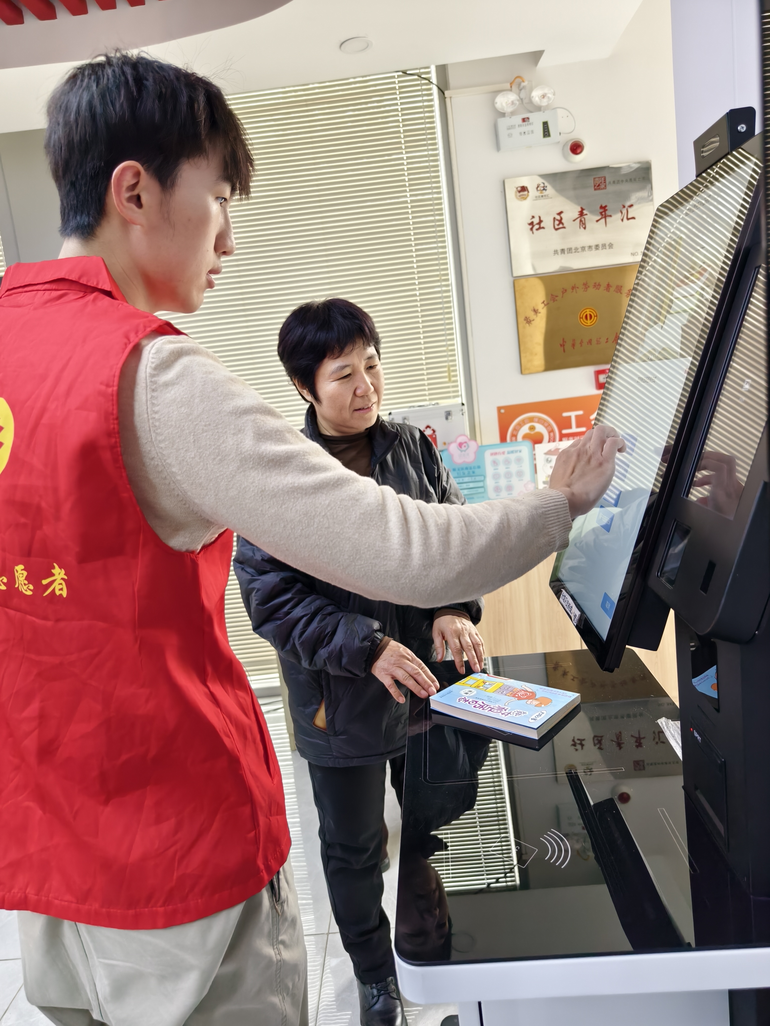整理过程中,志愿教师还耐心地为读者讲解“自助借书机”借书的操作步骤,并协助读者完成借书流程。