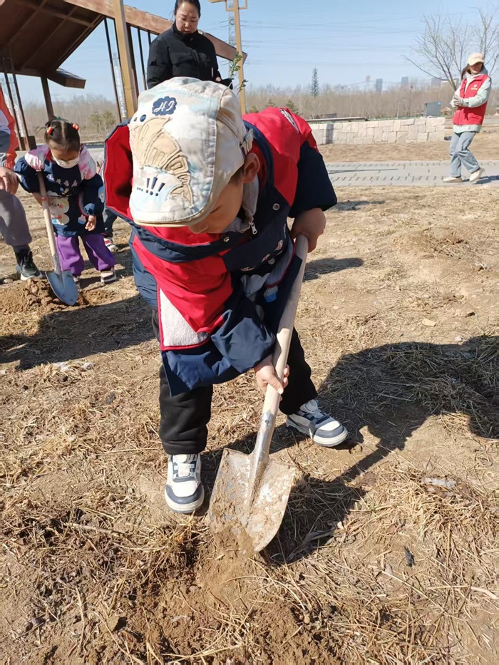 活动中,京京老师把稚嫩的小树苗分发给每位小朋友,大家精心呵护自己的幼苗,在家长和老师的帮助下,先用小铁锨挖了一个个深坑。随后,孩子们把小树苗轻轻地放进坑里,然后填土,浇水。大家看着自己亲手种下的小树,都露出了开心的灿烂笑容。