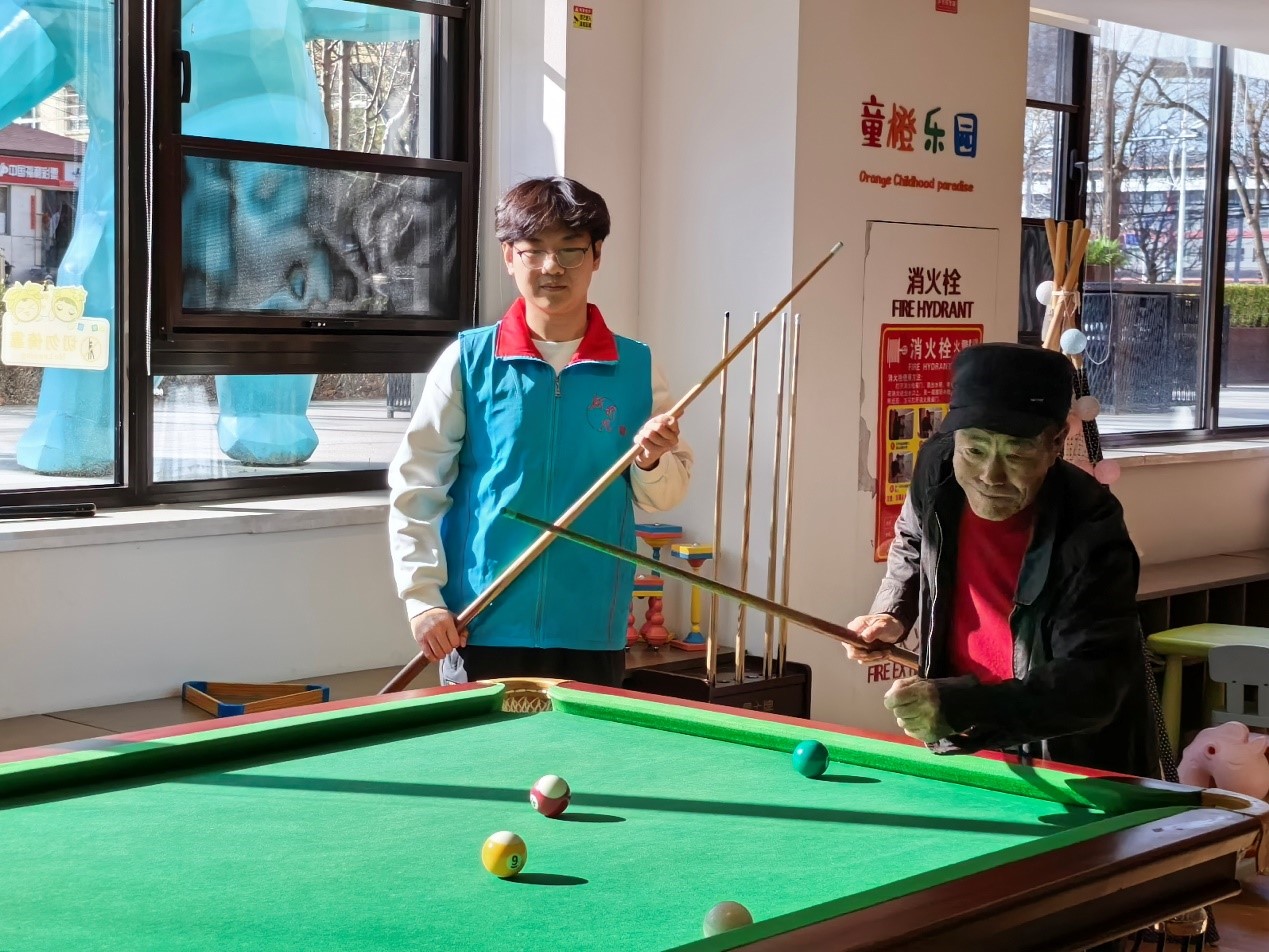 活动中,志愿者们有的同老人们围坐在一起,陪他们唠家常,倾听他们年轻时的奋斗故事和家庭趣事,有的则同老人们在台球桌展开“激烈”对局。现场欢声笑语不断,让社区都热闹了起来。