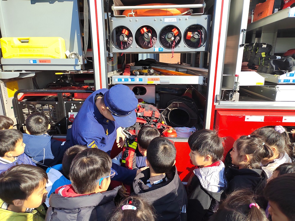 最后,消防员带学生们参观消防车,熟悉车辆装备和器材,让大家进一步了解消防安全知识,增强消防安全意识。