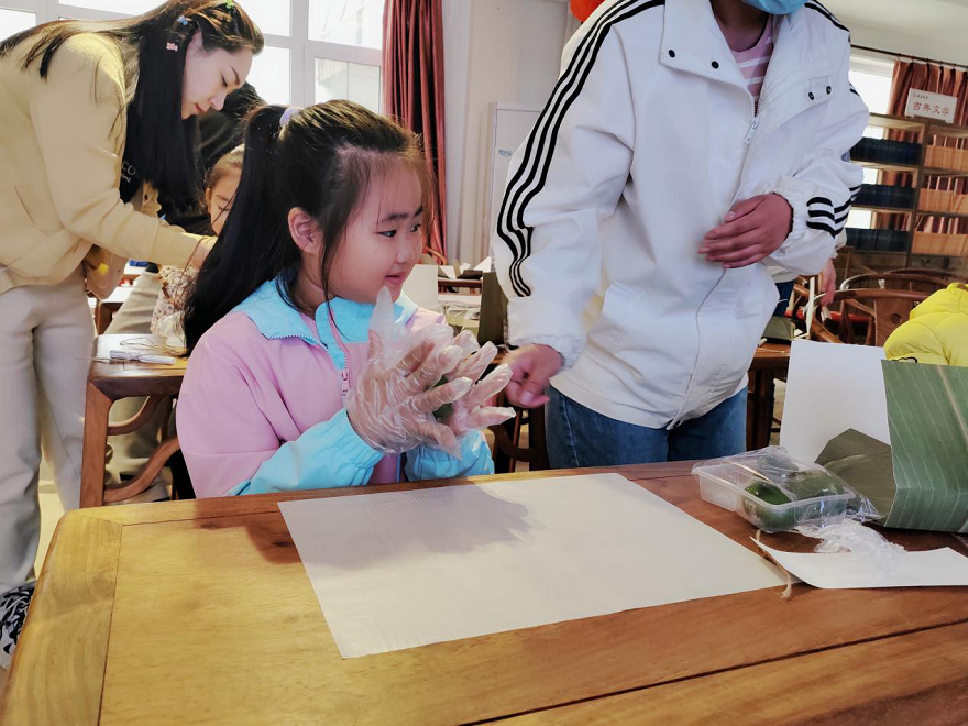 孩子们用绿色的小面团在手中揉搓,揉扁之后再放入馅料,最后再揉成小圆球。青团制作好后,迫不及待地吃上一口自己捏制的青团,心里乐开了花。