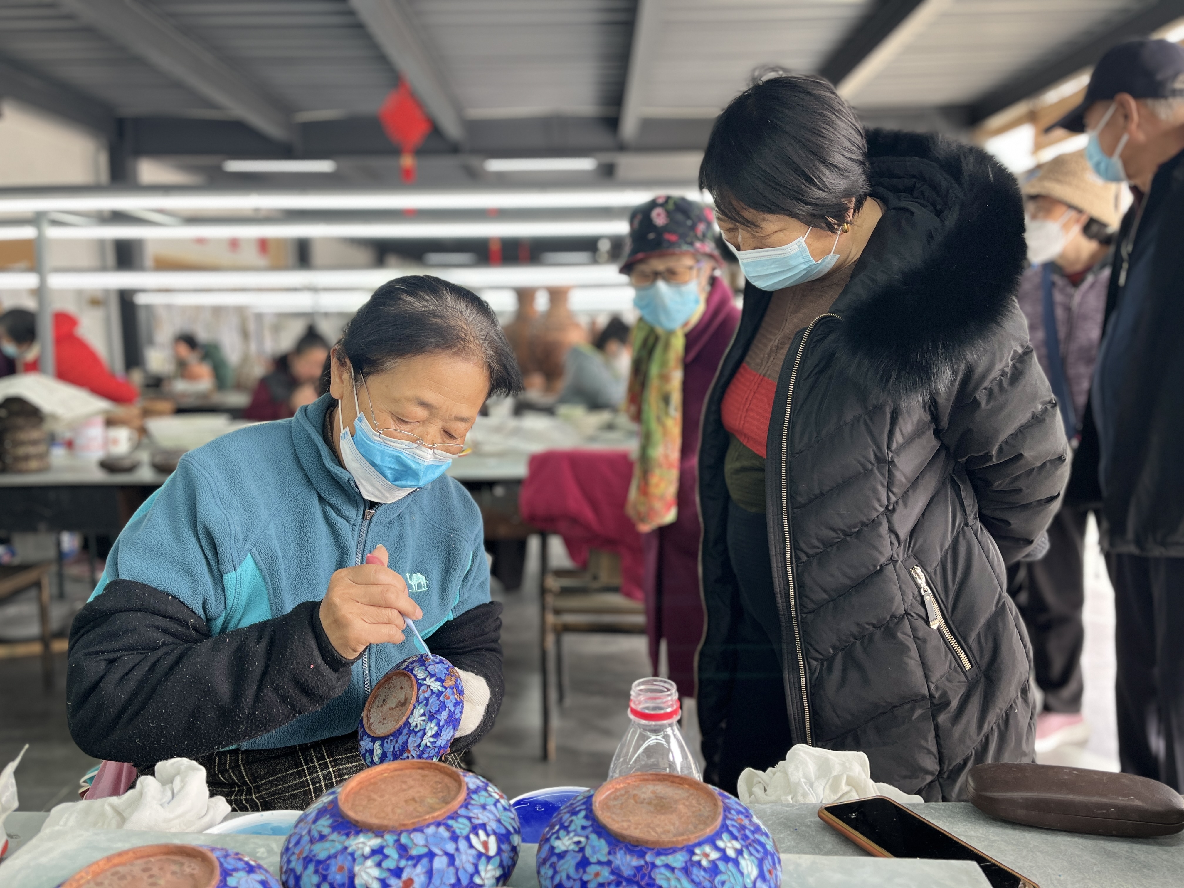 走到匠人的身旁,铜丝在她们手中像绣线一般,只是她们以镊子为针,铜丝为线,用一种更刚劲的方式在铜胎上绣花。各色釉料置于小碟,层层铺满了工作台,令人流连于“察碟观色”。