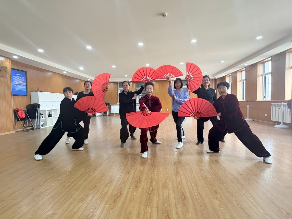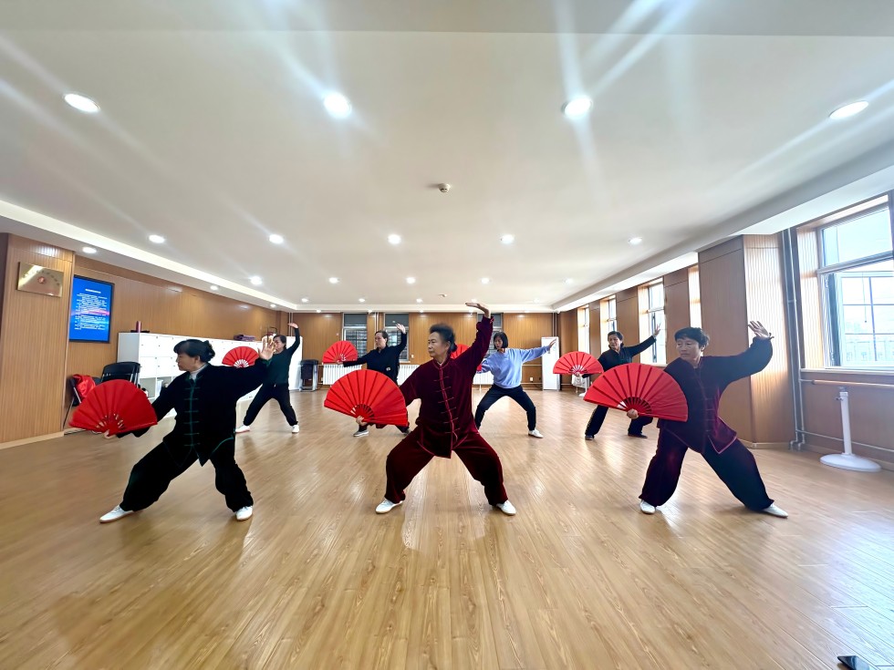 活动中,大家身着练功服,手持太极扇,跟着老师的示范和指导认真练习太极拳《中国功夫》,在 “开扇”、“收扇”、“云扇” 等多个基础动作中感受太极文化与武术精神。