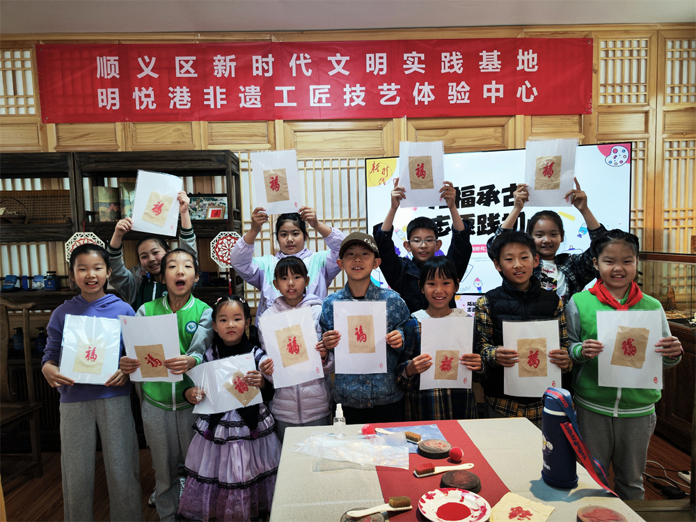 在非遗雕版拓印体验环节,老师向大家介绍雕版拓印这一古老技艺的历史渊源和制作流程。随后,孩子们怀着好奇与兴奋,亲手尝试拓印乾隆“福”字。大家小心翼翼地操作,专注于每一个细节,随着纸张慢慢揭开,一个个鲜红的“福”字跃然纸上。