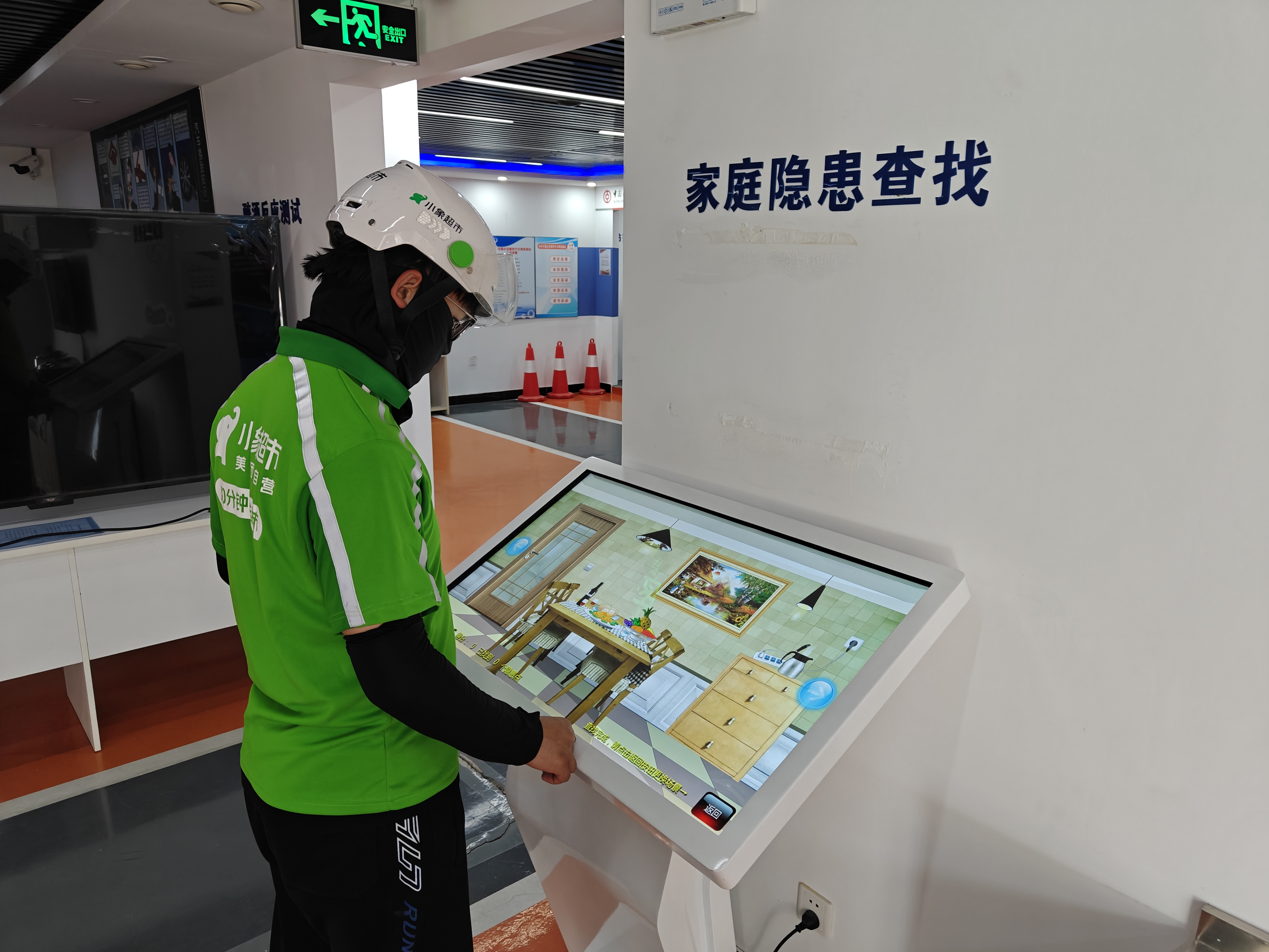 在互动体验环节设置了 “隐患大搜查” 游戏,骑手们进入模拟房间找出安全隐患并给出整改建议。此外,还安排了火灾逃生模拟演练,让骑手们在烟雾弥漫的模拟环境中练习正确使用湿毛巾捂口鼻、弯腰低姿逃生等自救技能。