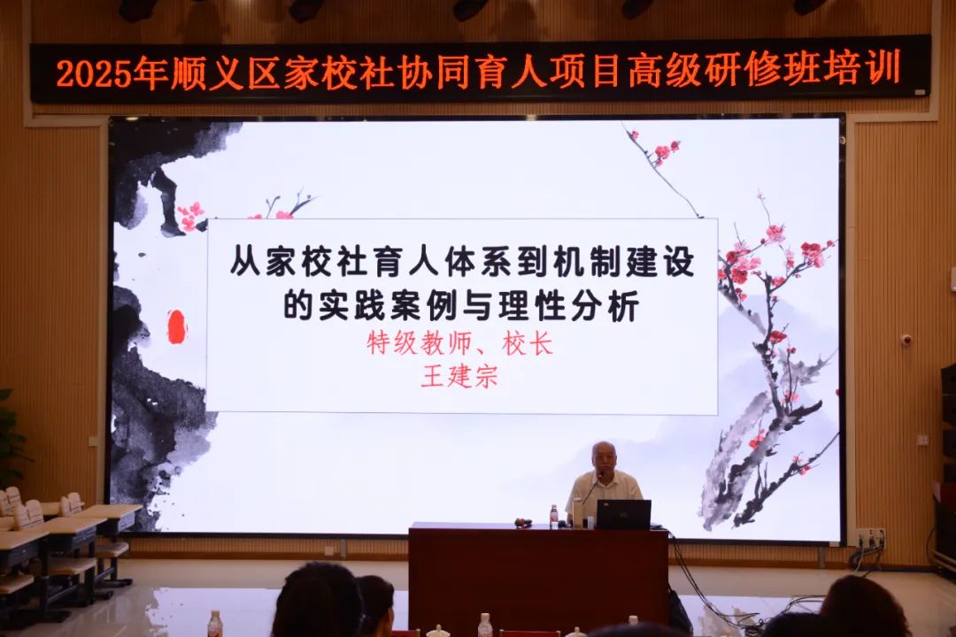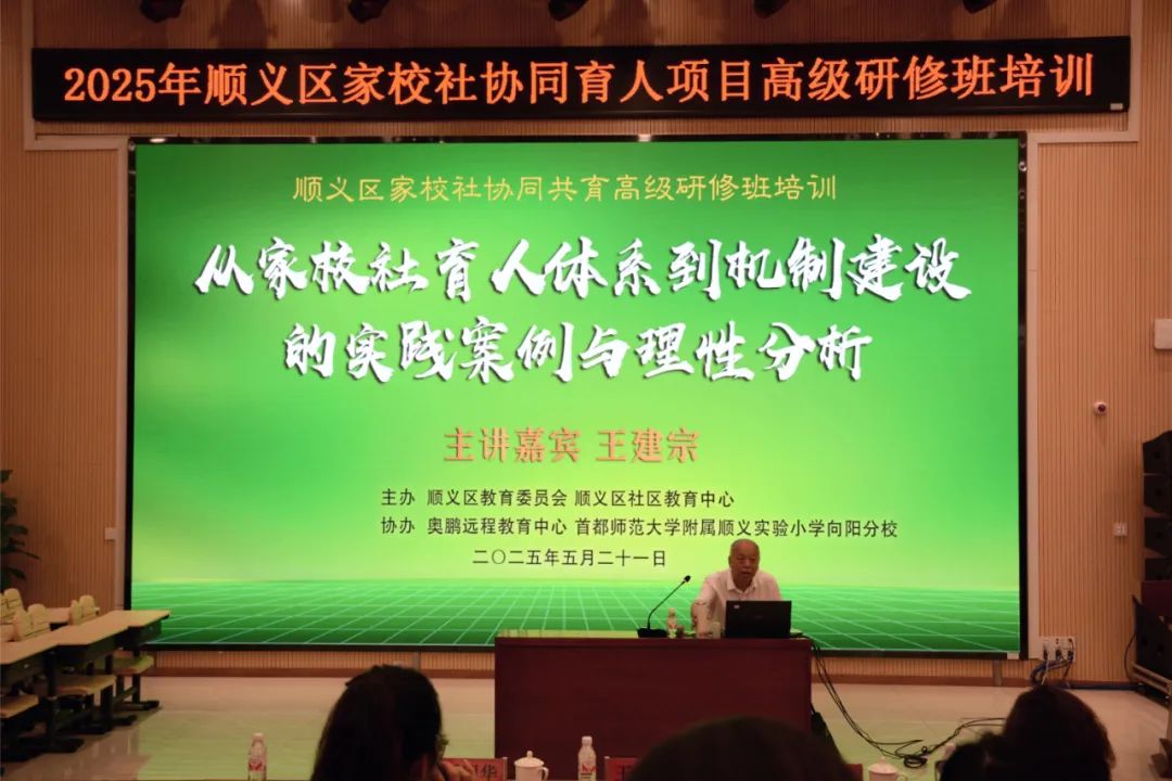 5月21日,顺义区社区教育中心新时代文明实践基地开展了顺义区家校社协同共育高级研修班专题培训。北京第十四中学原校长、北京市人大代表王建宗以《从家校社育人体系到机制建设的实践案例与理性分析》为主题,为顺义区小学德育干部、初中年级主任(组长)和紫禁杯班主任三个高研班近百名学员带来一场理论与实践深度融合的专题讲座。