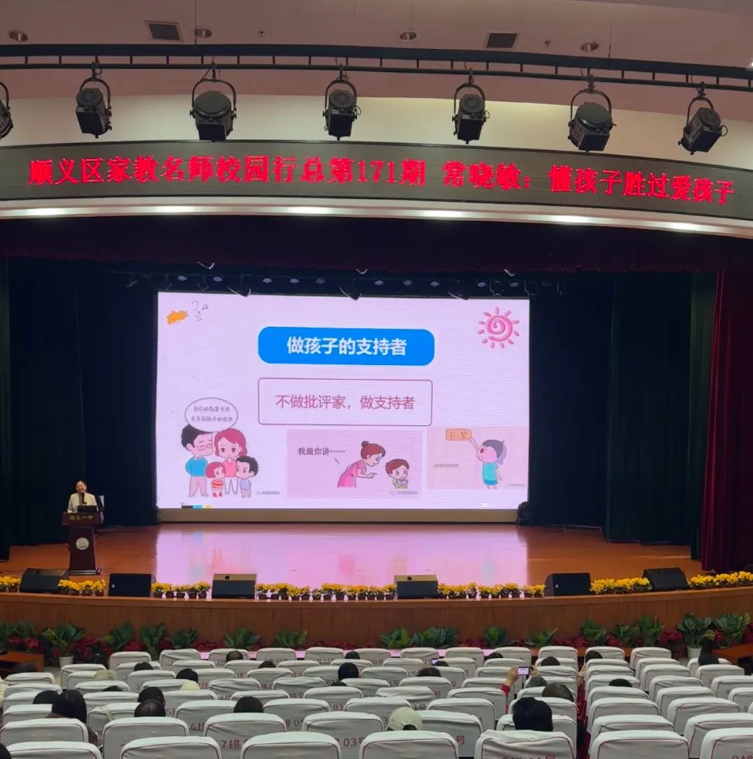 近日,由顺义区社区教育中心新时代文明实践基地主办的“家教名师校园行”活动走进顺义区第一中学。活动特邀学习治疗师高级讲师、清华大学社会科学学院积极心理学指导师常晓敏为学校师生开展“懂孩子胜过爱孩子”主题讲座。