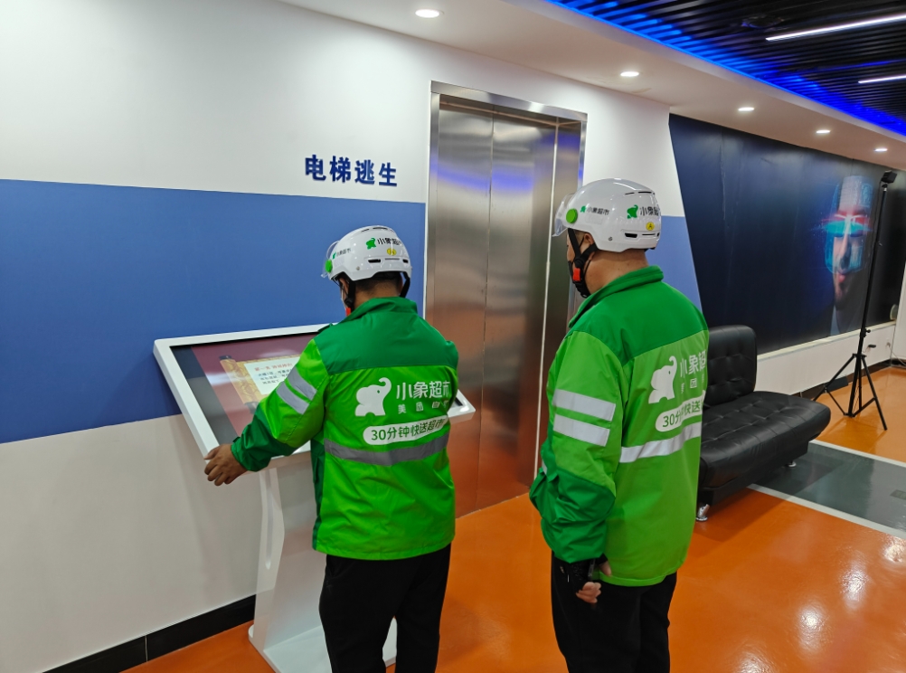 活动中,工作人员带大家一起观看电梯故障和公共场所急救的真实录像,让骑手们意识到学习安全技能的重要 性。 随后,在电梯逃生学习区 ,讲解员边示范 “踮脚、抱颈、背靠轿厢壁” 等防坠落姿势,边强调:“记住!电梯下坠时这些动作能保命!” 骑手们认真模仿练习,尽力掌握关键动作要领。接着,模拟电梯突然发出刺耳警报并停止运行,灯光熄灭,有人本能地伸手扒电梯门,讲解员立即提示:“别慌!用紧急呼叫按钮!”,大家迅速冷静下来,拿起对讲设备清晰报告被困位置。