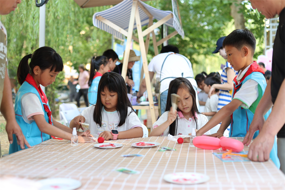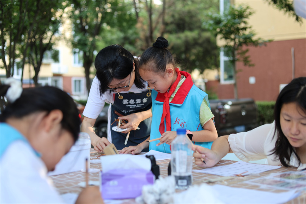 在漆扇制作、雕版拓印、女书体验等非遗项目摊位前,身着志愿服装的孩子们化身“小讲师”,他们站在摊位旁,用稚嫩却认真的声音,耐心地向参与体验的居民们讲解非遗项目。“小讲师们”的认真与热情,让传统文化以更生动的方式走进居民心中。