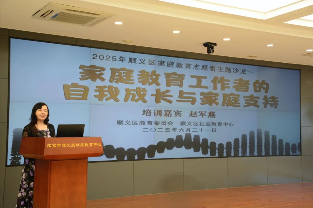 6月21日,2025年顺义区家庭教育志愿者系列主题沙龙活动在顺义区社区教育中心新时代文明实践基地举行。活动特邀首都师范大学心理素质教育与咨询中心主任、北京高教学会心理咨询研究会副会长赵军燕,为40名顺义区“哎与爱”家庭教育志愿者开展“家庭教育工作者的自我成长与家庭支持”体验式主题沙龙活动。