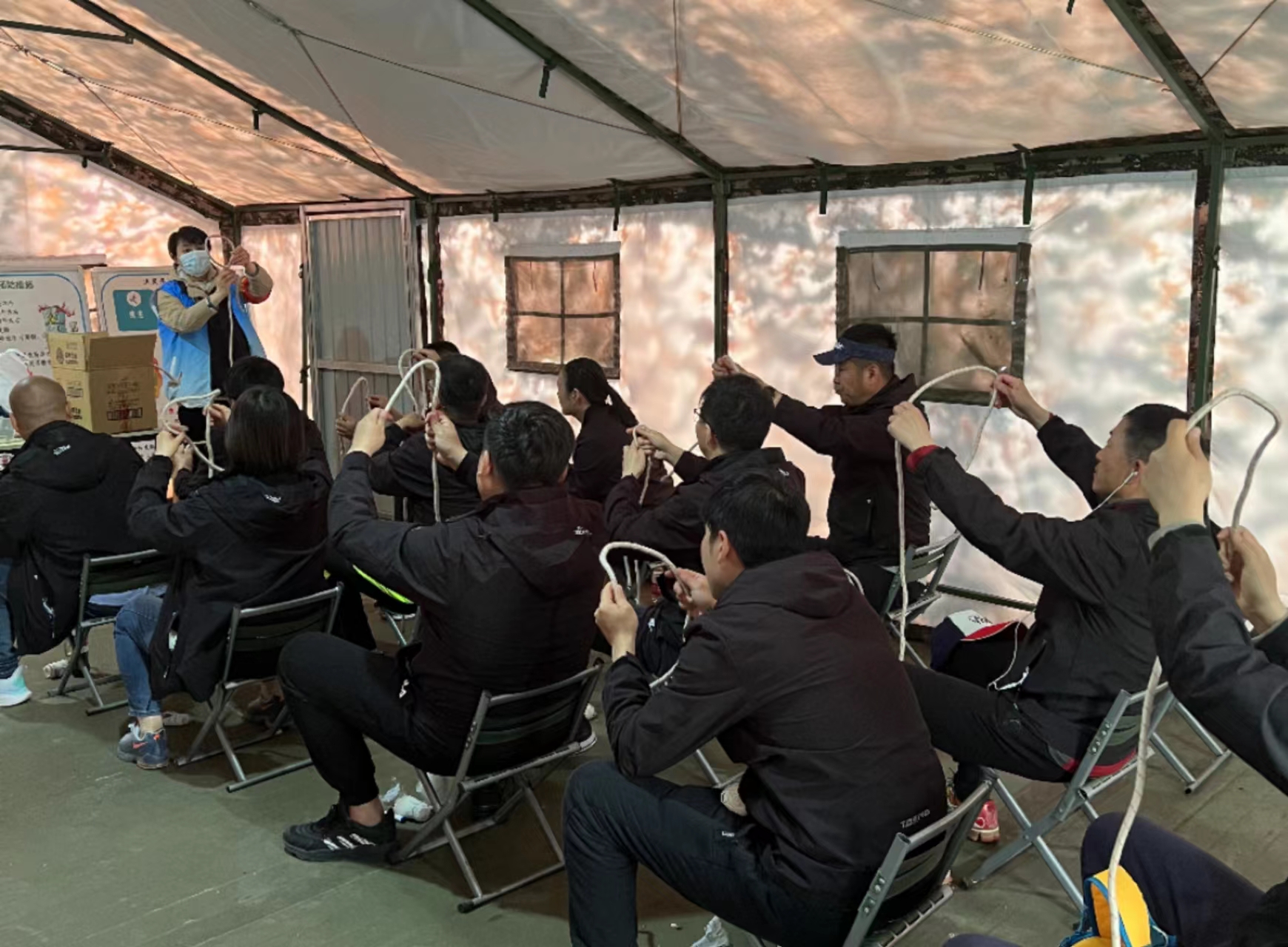 活动开始后,培训老师围绕应急安全知识、防灾减灾、自救互救、伤后包扎等方面内容进行讲解,并发放了相关知识手册。随后,在工作人员的指导下,居民们分批体验了VR沉浸灾情模拟,感受地震及消防场景,实操了救援绳结及开放性外伤包扎等项目,进一步深度学习了防灾减灾相关技能。