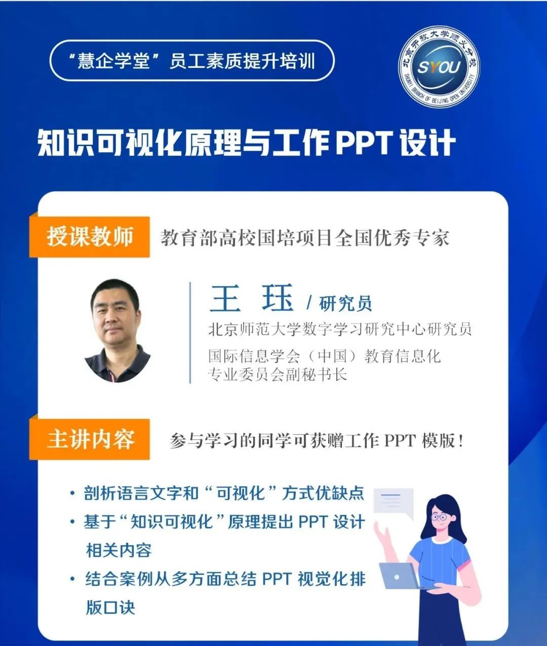 顺义区社区教育中心新时代文明实践基地“慧企学堂”以“知识可视化原理与工作 PPT设计”为主题,在线上开展员工素质提升培训第八讲。活动邀请北京师范大学数字学习研究中心研究员、国际信息学会(中国)教育信息化专业委员会副秘书长王珏授课,“慧企学堂”学员近300人参加。 [查看详情]