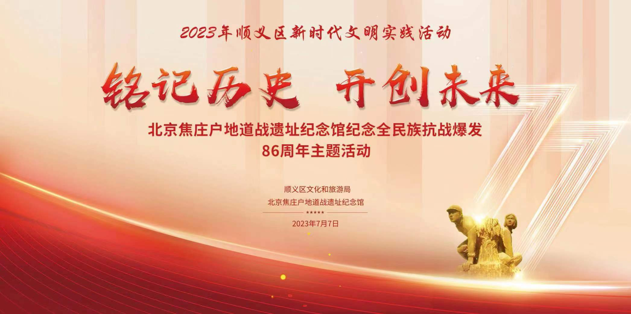 2023年是全民族抗战爆发86周年纪念日,为进一步学习贯彻党的二十大精神,深入开展习近平新时代中国特色社会主义思想主题教育,纪念全民族抗战,缅怀革命先烈,发挥全国爱国主义教育示范基地作用。7月7日,北京焦庄户地道战遗址纪念馆新时代文明实践基地开展“铭记历史 开创未来”主题纪念活动。 [查看详情]