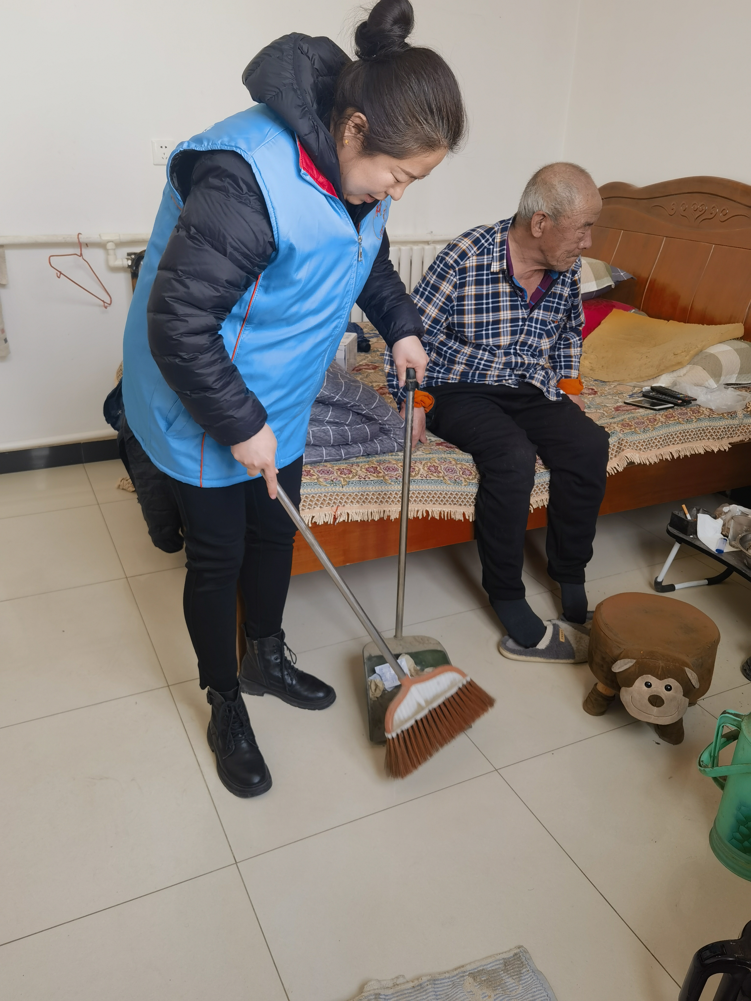 志愿者服务队组织去独居老人家里陪老人聊天、关心老人身体情况、帮助老人打扫卫生等。