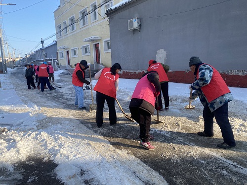 2022年2月15日,北石槽镇二张营村绿色环保志愿服务队开展村内积雪清除活动,保障村民出行安全,助力创城。