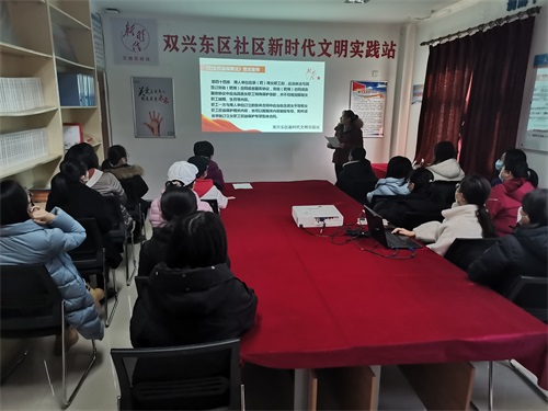 2023年3月7日,双兴东区新时代文明实践站教育服务志愿服务队开展“妇女权益保障法”普法宣传活动